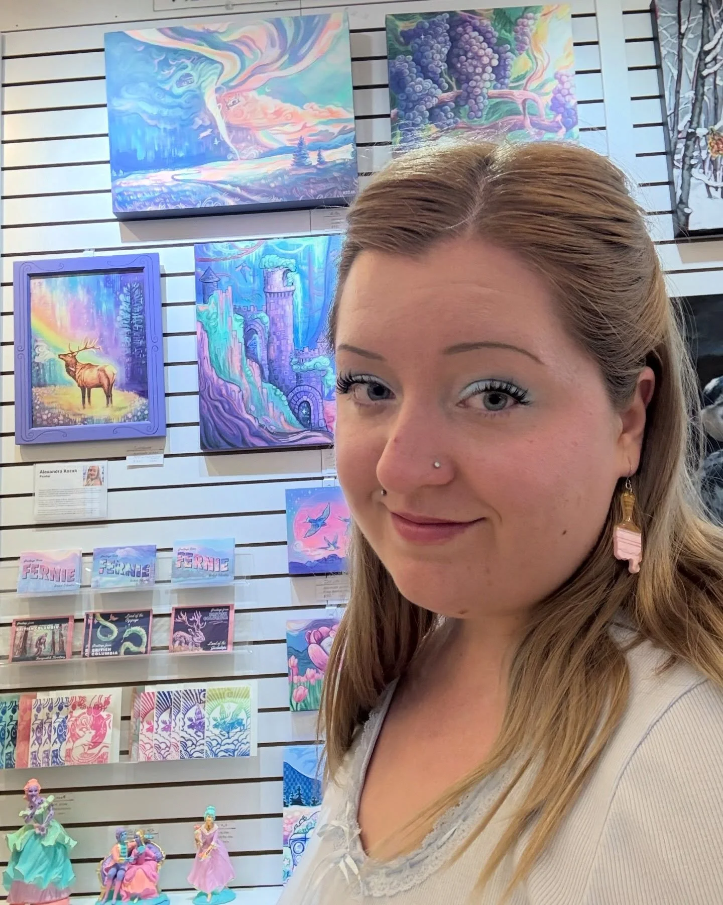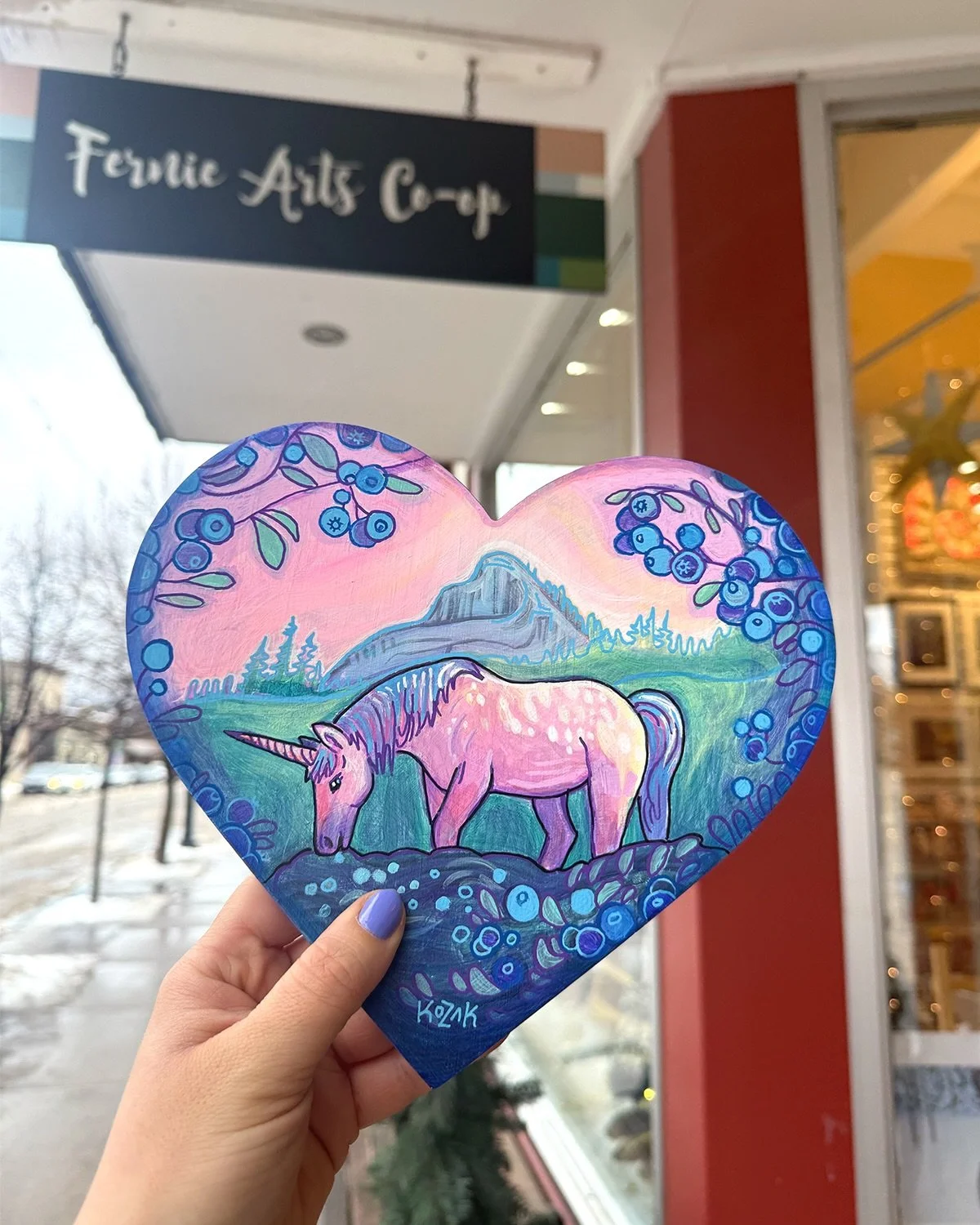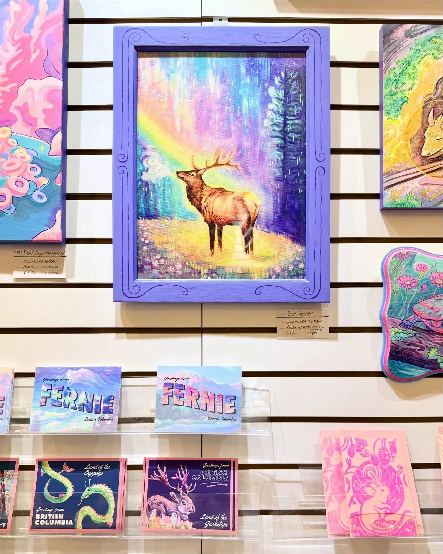 Alexandra Kozak is an artist and designer based in Fernie, BC. Inspired by fairytales & flower power, she paints the essence of nature with a psychedelic sensibility. Her work combines a distinct colour palette with whimsical design, transforming familiar landscapes and wildlife into visual narratives.